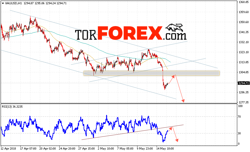 Таким образом, XAU/USD прогноз цен на Золото на 17 мая 2018 предполагает попытку теста области сопротивления вблизи уровня 1305 и продолжения падения котировок с целью ниже уровня 1285, отменой варианта падения цен на Золото выступит пробой уровня 1315, в этом случае стоит ожидать продолжения роста в область выше уровня 1355.