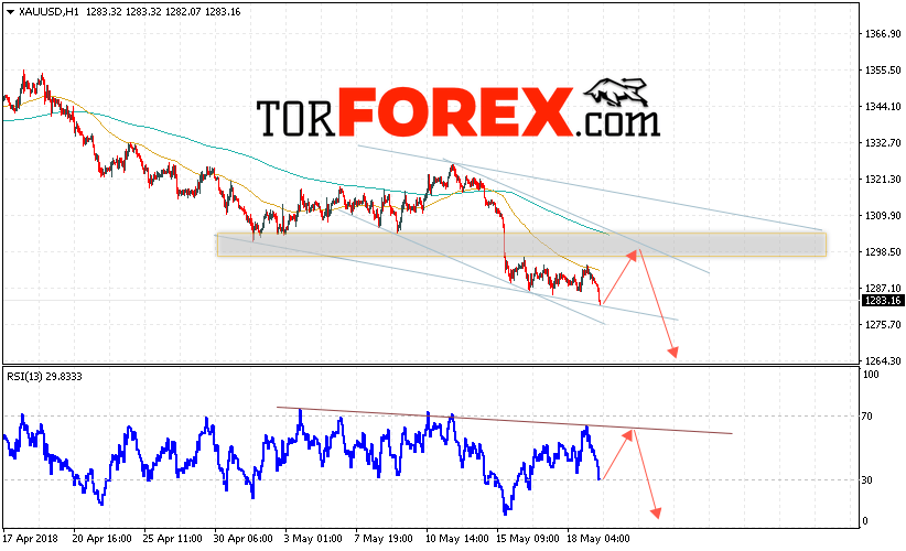 Таким образом, XAU/USD прогноз цен на Золото на 22 мая 2018 предполагает попытку теста области сопротивления вблизи уровня 1300 и продолжения падения котировок с целью ниже уровня 1265, отменой варианта падения цен на Золото выступит пробой уровня 1315, в этом случае стоит ожидать продолжения роста в область выше уровня 1355.