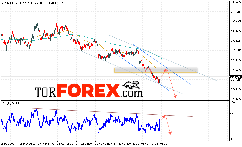 Котировки Золота XAU/USD продолжают движение в нисходящей тенденции. На данный момент стоит ожидать попытку уровня сопротивления вблизи области 1265. Откуда стоит ожидать отскок и продолжения падения цены на Золото с целью ниже уровня 1210.