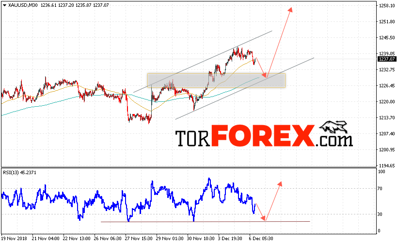 Таким образом, XAU/USD прогноз цен на Золото на 7 декабря 2018 предполагает попытку теста области поддержки вблизи уровня 1230. Далее, продолжение роста котировок с целью выше уровня 1260. Отменой варианта роста цен на Золото выступит падение и пробой уровня 1220. Это укажет на пробой области поддержки. В этом случае стоит ожидать продолжения падения Золота ниже уровня 1195.