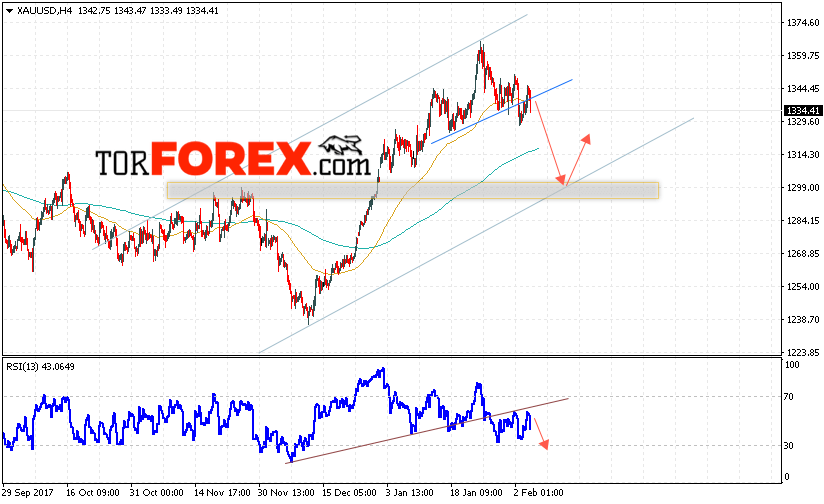 Котировки Золота XAU/USD продолжают движение в рамках формирования разворотной Форекс модели. На данный момент стоит ожидать попытку теста уровня 1335 в рамках завершения формирования разворотной модели «Голова и плечи». Откуда стоит ожидать отскок и начала падения цены на Золото с целью ниже уровня 1300.