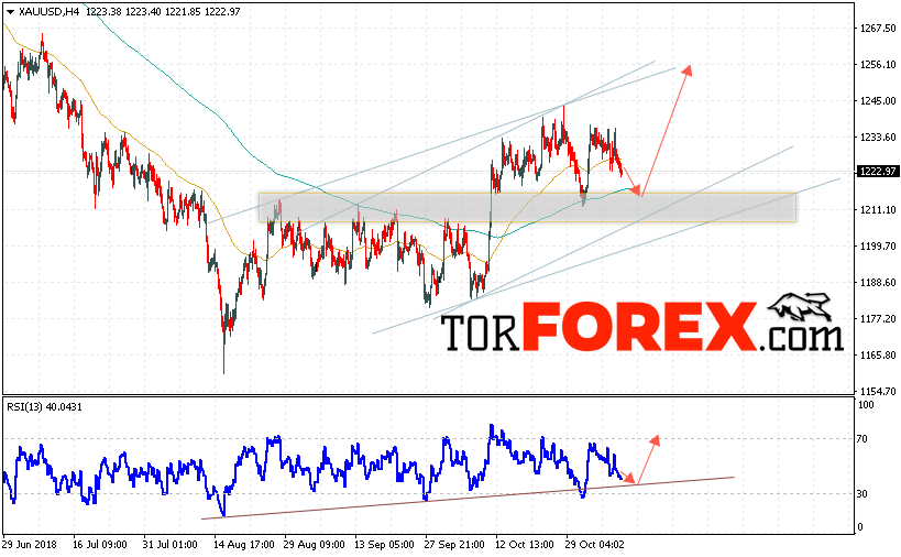 Таким образом, XAU/USD прогноз цен на Золото на 9 ноября 2018 предполагает попытку теста области поддержки вблизи уровня 1220. Затем продолжение роста котировок с целью выше уровня 1255. Отменой варианта роста цен на Золото выступит падение и пробой уровня 1210. Это укажет на пробой нижней границы канала. В этом случае стоит ожидать продолжения падения Золота ниже уровня 1190.