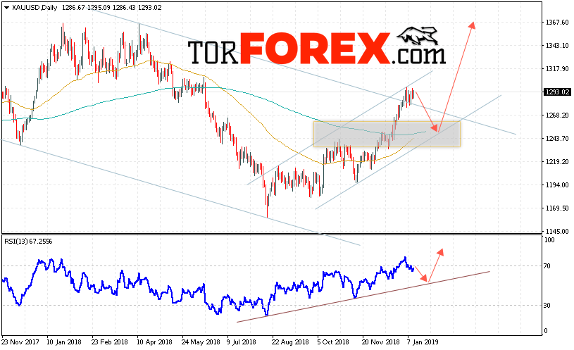 Таким образом, XAU/USD прогноз цен Золота на 14 — 18 января 2019 предполагает попытку теста уровня поддержки вблизи области 1260. Затем продолжение роста цен на Золото с целью выше уровня 1365. В пользу роста выступит тест линии поддержки на индикаторе относительной силы. Отменой варианта роста Золота станет падение и пробой уровня 1235. Это укажет на продолжение снижения котировок в область ниже уровня 1165.