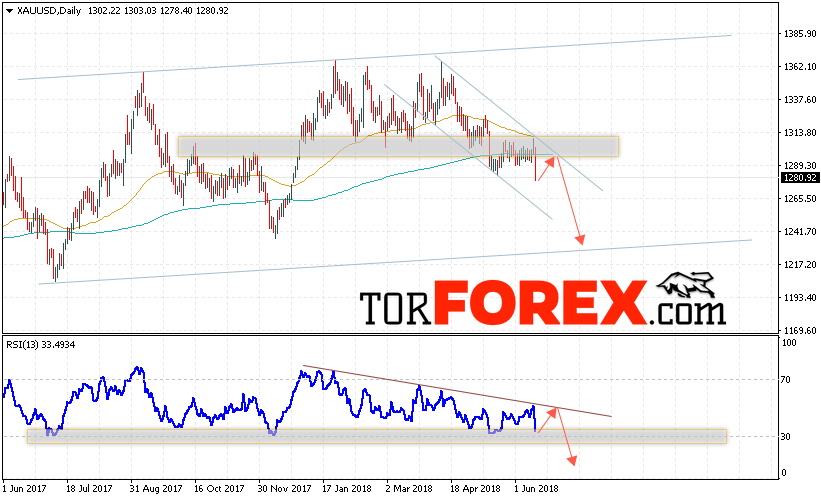 Таким образом, XAU/USD прогноз цен Золота на 18 — 22 июня 2018 предполагает попытку теста уровня сопротивления вблизи области 1300 и продолжения падения цен на Золото с целью ниже уровня 1240, в пользу падения выступит тест линии тренда на индикаторе относительной силы, отменой варианта падения Золота станет пробой уровня 1320, что укажет на продолжение роста в область выше уровня 1365.