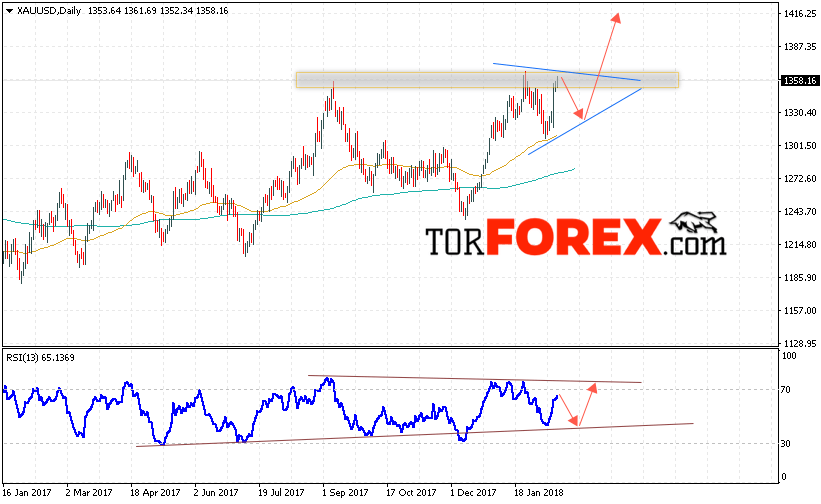 Таким образом, XAU USD прогноз цен Золота на 19 — 23 февраля 2018 предполагает попытку теста нижней границы модели «Треугольник» вблизи области 1300 и начала роста цен на Золото с целью выше уровня 1415, в пользу роста выступит тест линии тренда на индикаторе относительной силы, отменой варианта роста Золота станет пробой уровня 1315, что укажет на продолжение падения.