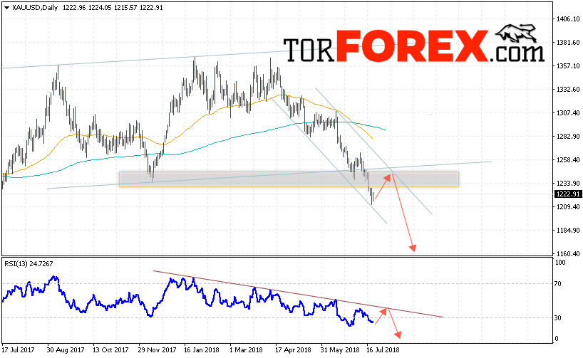 Таким образом, XAU/USD прогноз цен Золота на 23 — 27 июля 2018 предполагает попытку теста уровня сопротивления вблизи области 1235 и продолжения падения цен на Золото с целью ниже уровня 1160, в пользу падения выступит тест линии тренда на индикаторе относительной силы, отменой варианта падения Золота станет пробой уровня 1260, что укажет на выход котировок за пределы канала и продолжение роста в область выше уровня 1305.