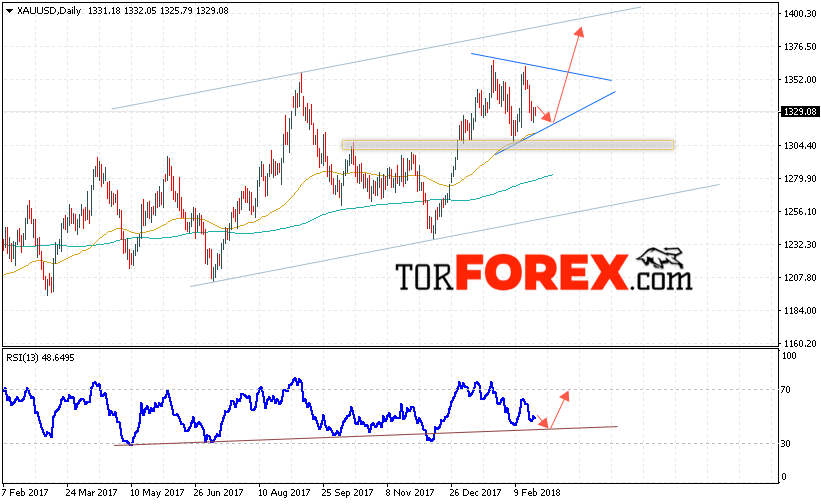 Таким образом, XAU/USD прогноз цен Золота на 26 февраля — 2 марта 2018 предполагает попытку теста нижней границы модели «Треугольник» вблизи области 1300 и начала роста цен на Золото с целью выше уровня 1415, в пользу роста выступит тест линии тренда на индикаторе относительной силы, отменой варианта роста Золота станет пробой уровня 1315, что укажет на продолжение падения.