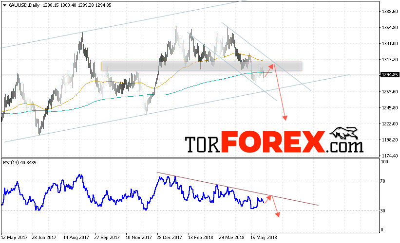 Таким образом, XAU/USD прогноз цен Золота на 4 — 8 июня 2018 предполагает попытку теста уровня сопротивления вблизи области 1300 и начала падения цен на Золото с целью ниже уровня 1230, в пользу падения выступит тест линии тренда на индикаторе относительной силы, отменой варианта падения Золота станет пробой уровня 1325, что укажет на продолжение роста в область выше уровня 1365.