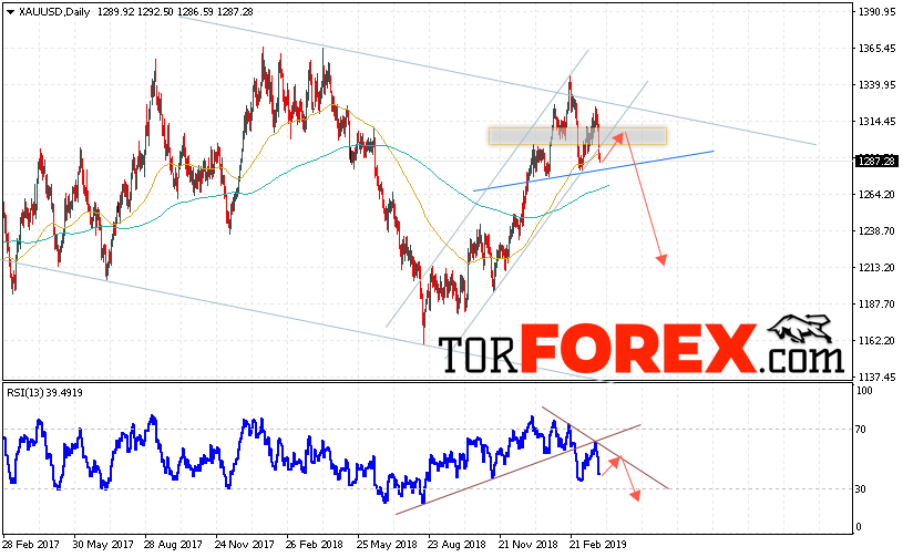 В пользу снижения котировок и цен на Золото на текущей торговой неделе 1 — 5 апреля 2019 выступит тест восходящей линии тренда на индикаторе относительной силы. Вторым сигналом станет завершение формирования разворотной модели «Голова и плечи». Отменой варианта падения котировок XAU/USD выступит сильный рост и пробой области 1345. Это укажет на пробой уровня сопротивления и продолжение роста цен на Золото с целью выше уровня 1365. Подтверждением развития снижения выступит пробой уровня поддержки и закрытие ниже области 1280. Это укажет на ускорение падения цены на Золото и завершение формирования разворотной модели.