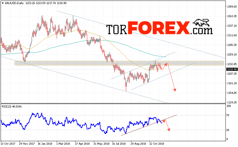 Таким образом, XAU/USD прогноз цен Золота на неделю 12 — 16 ноября 2018 предполагает попытку теста уровня сопротивления вблизи области 1230. Затем продолжения падения цен на Золото с целью ниже уровня 1155. В пользу снижения выступит тест линии тренда на индикаторе относительной силы. Отменой варианта падения Золота станет сильный рост и пробой уровня 1245. Это укажет на продолжение роста котировок в область выше уровня 1285.