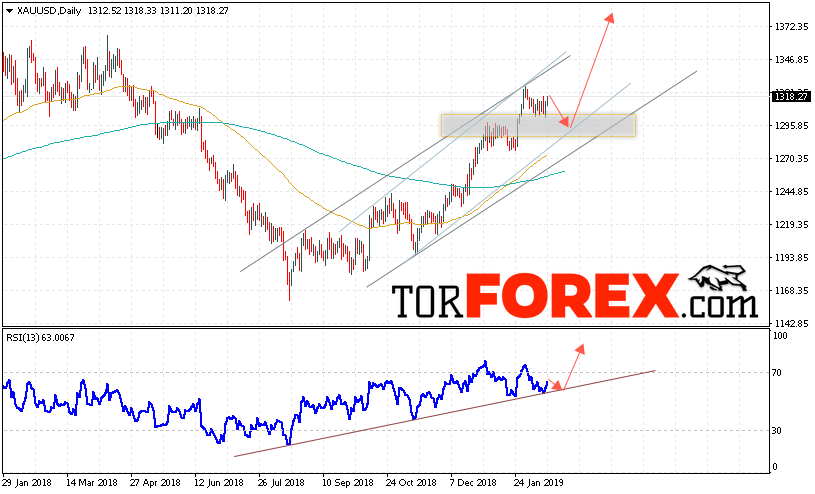 Таким образом, XAU/USD прогноз цен Золота на неделю 18 — 22 февраля 2019 предполагает попытку теста уровня поддержки вблизи области 1295. Затем продолжение роста цен на Золото с целью выше уровня 1380. В пользу роста выступит тест линии поддержки на индикаторе относительной силы. Отменой варианта роста Золота станет падение и пробой уровня 1270. Это укажет на продолжение снижения котировок в область ниже уровня 1215.