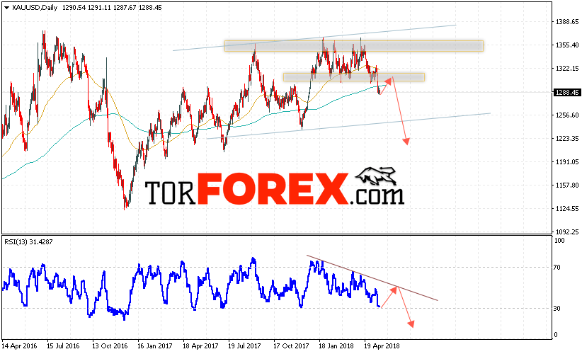 Таким образом, XAU/USD прогноз цен Золота на неделю 21 — 25 мая 2018 предполагает попытку теста уровня сопротивления вблизи области 1310 и начала падения цен на Золото с целью ниже уровня 1225, в пользу падения выступит тест линии тренда на индикаторе относительной силы, отменой варианта падения Золота станет пробой уровня 1330, что укажет на продолжение роста в область выше уровня 1375.