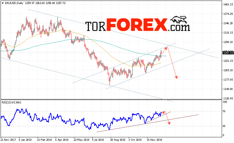 В пользу снижения котировок и цен на Золото на текущей торговой неделе 24 — 28 декабря 2018 выступит формирование разворотной модели «Голова и плечи» на индикаторе относительной силы. А также отскок от верхней границы нисходящего канала. Отменой варианта падения котировок XAU/USD выступит сильный рост и пробой области 1295. Это укажет на пробой верхней границы канала и продолжение роста цен на Золото с целью выше уровня 1335. Подтверждением развития снижения выступит пробой нижней границы восходящего канала и закрытие ниже уровня 1210. Это укажет на ускорение падения цены на Золото.