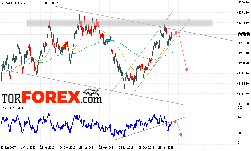 Таким образом, XAU/USD прогноз цен Золота на неделю 25 — 29 марта 2019 предполагает попытку теста уровня сопротивления вблизи области 1320. Затем продолжение падения цен на Золото с целью ниже уровня 1210. В пользу снижения выступит тест линии тренда на индикаторе относительной силы. Отменой варианта падения Золота станет сильный рост и пробой уровня 1345. Это укажет на продолжение роста котировок в область выше уровня 1375.