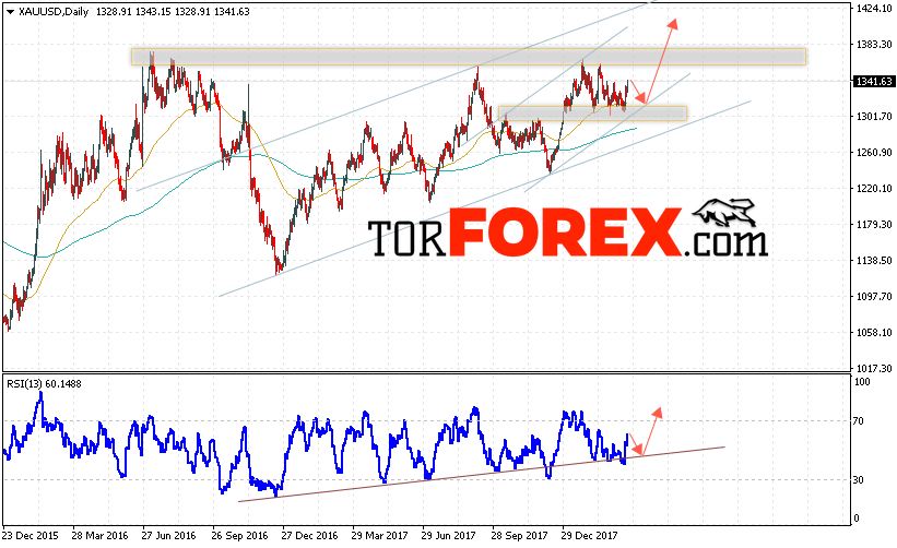 Таким образом, XAU/USD прогноз цен Золота на неделю 26 — 30 марта 2018 предполагает попытку теста нижней границы восходящего канала вблизи области 1310 и начала роста цен на Золото с целью выше уровня 1420, в пользу роста выступит тест линии тренда на индикаторе относительной силы, отменой варианта роста Золота станет пробой уровня 1280, что укажет на продолжение падения в область ниже 1220.
