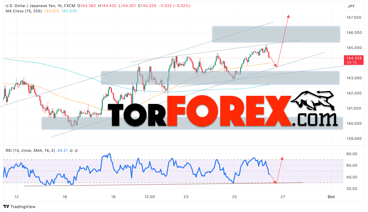 Котировки валютной пары Доллар Иена USDJPY продолжают движение в рамках развития коррекции после отбой верхней границы бычьего канала. В момент публикации прогноза курс Доллара США к Японской Иене составляет 144.32. Скользящие средние указывают на наличие краткосрочной бычьей тенденции по паре. Цены пробили область между сигнальными линиями вверх, что указывает на давление со стороны покупателей Доллара США и потенциальное продолжение падения цен уже с текущих уровней. В рамках прогноза курса Японской Иены на 27 сентября 2024 стоит ожидать попытку развития снижения цены и тест области поддержки вблизи уровня 143.95. Далее, отскок цены вверх и продолжение роста пары USD/JPY в область выше уровня 147.05.