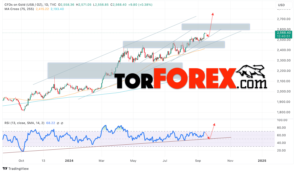 Дополнительным сигналом в пользу подъёма котировок XAU/USD выступит тест линии поддержки на индикаторе относительной силы. Вторым сигналом станет пробой от нижней границы бычьего канала. Отменой варианта роста цен на 16 — 20 сентября 2024 выступит падение цен и пробой уровня 2465. Это укажет на пробой нижней границы канала и продолжение снижения котировок актива в область ниже уровня 2405. Ожидать ускорения роста котировок XAU/USD стоит с пробоем области сопротивления и закрытием цены над уровнем 2635.