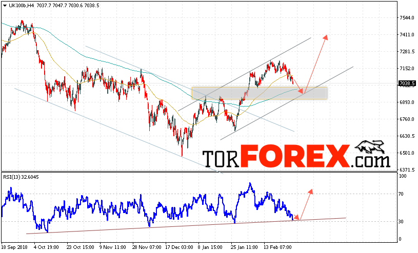 Таким образом, FTSE 100 прогноз и аналитика на 1 марта 2019 предполагает попытку теста нижней границы канала вблизи области 6985. Затем продолжение роста в область выше уровня 7415. В пользу подъёма котировок FTSE 100 выступит тест линии поддержки на индикаторе относительной силы. Отменой варианта роста выступит падение и пробой области 6880. Это укажет на продолжение падения с целью ниже области 6650.