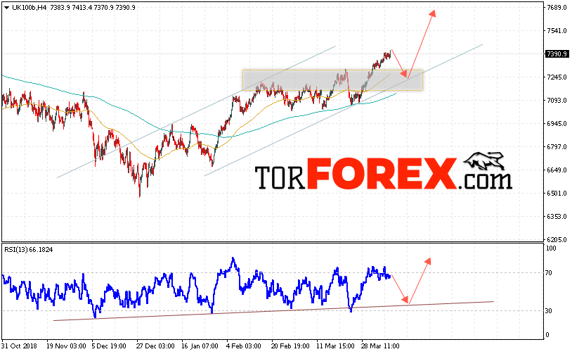 Таким образом, FTSE 100 прогноз и аналитика на 10 апреля 2019 предполагает попытку теста нижней границы восходящего канала вблизи области 7245. Затем продолжение роста в область выше уровня 7650. В пользу подъёма котировок FTSE 100 выступит тест линии поддержки на индикаторе относительной силы. Отменой варианта роста выступит падение и пробой области 7085. Это укажет на продолжение снижения с целью ниже области 6750.
