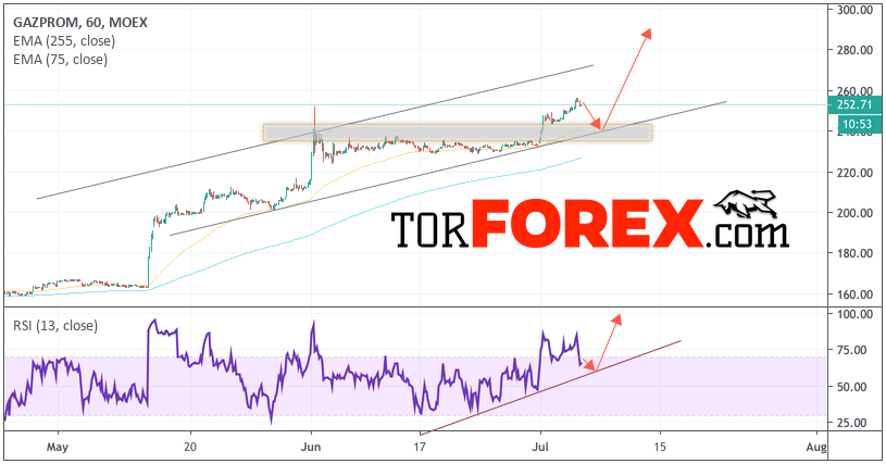 Котировки акций компании Газпром продолжает движение в рамках сильного роста и восходящего канала. Скользящие средние указывают на наличие бычьей тенденции. В момент публикации прогноза цена акций Газпром составляет 252.71. На данный момент стоит ожидать попытку снижения и тест уровня поддержки вблизи области 245.00. Затем отскок и продолжение роста стоимости акций в область выше уровня 285.00.