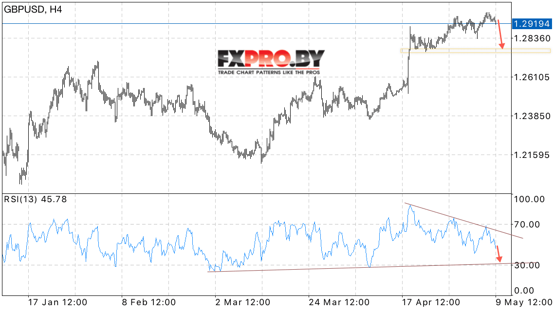 В пользу снижения пары выступает отскок от нисходящей линии тренда на индикаторе относительной силы. Отменой варианта падения котировок GBP/USD станет сильный рост и пробой области локального максимума, что укажет на продолжение роста пары в область выше уровня 1.31. Ожидать ускорения падения фунта против доллара США стоит с пробоем области 1.2850.