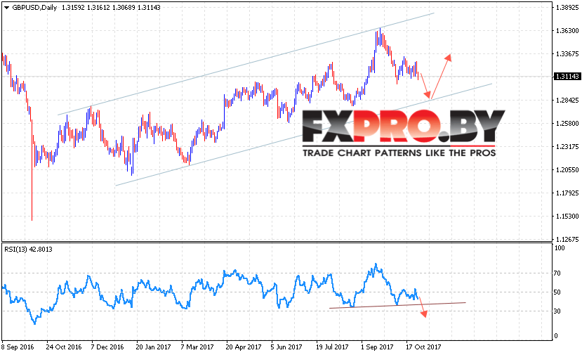 В пользу снижения Британского Фунта выступит пробой линии поддержки на индикаторе относительной силы. Ожидать ускорения падения пары GBP/USD стоит с пробоем нижней границы канала и закрытием ниже уровня 1.2750. Основным событием текущей торговой недели является Решение по основной процентной ставке Банка Англии, которое состоится 2 ноября 2017, ожидается, что ставка изменится с уровня 0.25 до 0.5%, что может оказать поддержку Британскому Фунту.