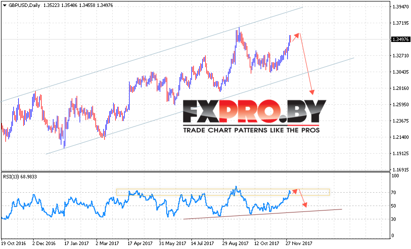 Таким образом, GBP USD прогноз Форекс на 4 — 8 декабря 2017 предполагает попытку теста уровня 1.3550, откуда стоит ожидать продолжения снижения пары в рамках начала отработки разворотной модели «Голова и плечи», в пользу падения выступит тест области сопротивления на индикаторе относительной силы, ожидать ускорения падения пары стоит с пробоем уровня 1.2950.
