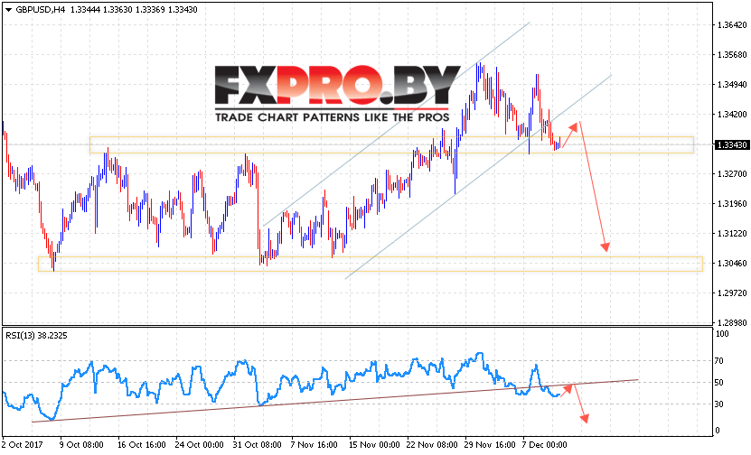 Таким образом, GBP/USD прогноз Фунт Доллар на 13 декабря 2017 предполагает попытку теста уровня 1.3410 и продолжения падения пары с целью на уровне 1.3070, дополнительным сигналом в пользу снижения Британского Фунта выступит тест линии тренда на индикаторе относительной силы, отменой варианта падения пары станет пробой уровня 1.3590.