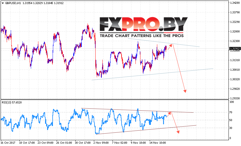 Таким образом, GBP/USD прогноз Фунт Доллар на 17 ноября 2017 предполагает попытку теста верхней границы модели и продолжения падения с целью ниже уровня 1.30 в рамках начала отработки модели «Треугольник», дополнительным сигналом в пользу падения Британского Фунта выступит тест линии сопротивления на индикаторе относительной силы, отменой варианта снижения пары станет пробой уровня 1.3250.