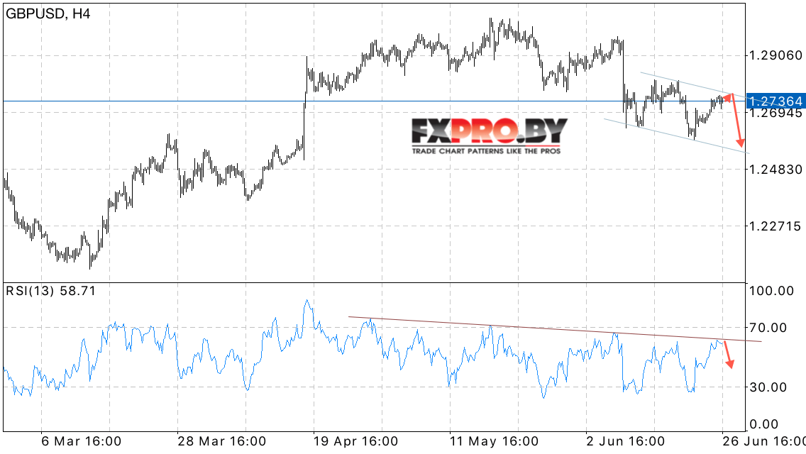 Таким образом, GBP/USD прогноз Фунт Доллар на 27 июня 2017 предполагает попытку падения в область ниже уровня 1.25 в рамках отскока от верхней границы нисходящего канала, дополнительным сигналом выступает тест линии тренда на индикаторе относительной силы.