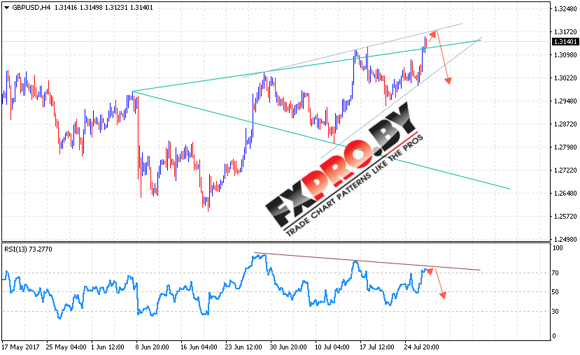 Таким образом, GBP/USD прогноз Фунт Доллар на 28 июля 2017 предполагает попытку падения в рамках начала отработки медвежьей модели волны Вульфа с потенциальной целью снижения на уровне 1.28, дополнительным сигналом выступает тест линии тренда на индикаторе относительной силы.