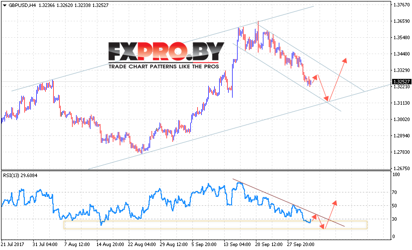 Таким образом, GBP/USD прогноз Фунт Доллар на 4 октября 2017 предполагает попытку теста нижней границы восходящего канала и продолжение роста с целью вблизи уровня 1.3400, дополнительным сигналом в пользу роста Фунта против Доллара США выступит пробой нисходящей линии тренда на индикаторе относительной силы.