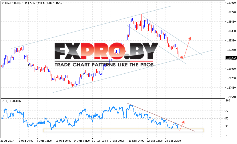 Таким образом, GBP/USD прогноз Фунт Доллар на 6 октября 2017 предполагает попытку отскока от уровня нижней границы восходящего канала с целью роста выше 1.34, дополнительным сигналом в пользу роста Фунта против Доллара США выступает тест области поддержки на индикаторе относительной силы, отменой роста станет пробой уровня 1.3050.
