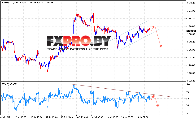 Таким образом, GBP/USD прогноз и анализ Фунт Доллар на 26 июля 2017 предполагает попытку снижения в область ниже уровня 1.2950 в рамках отскока от линии тренда на индикаторе относительной силы, отменой выступит пробой уровня 1.31.
