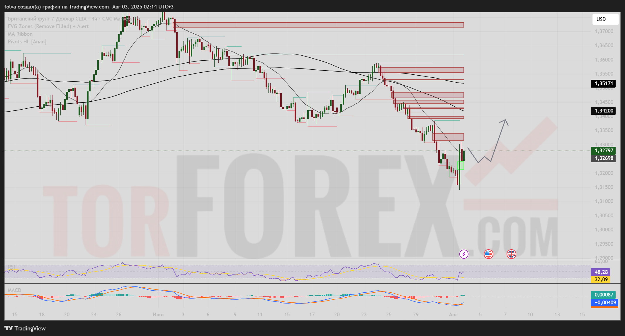 Торговая пара GBP/USD завершила июль и начала август с обновления годового минимума на уровне 1,3141, после чего резко отскочила вверх, закрыв неделю у 1,3279. На графике 4H прослеживается попытка формирования краткосрочного разворота на фоне восстановления от зоны спроса. Прогноз строится с учётом Pivot-уровней, EMA-ленты, FVG-зон, а также индикаторов RSI и MACD, отображающих потенциал дальнейшего движения.