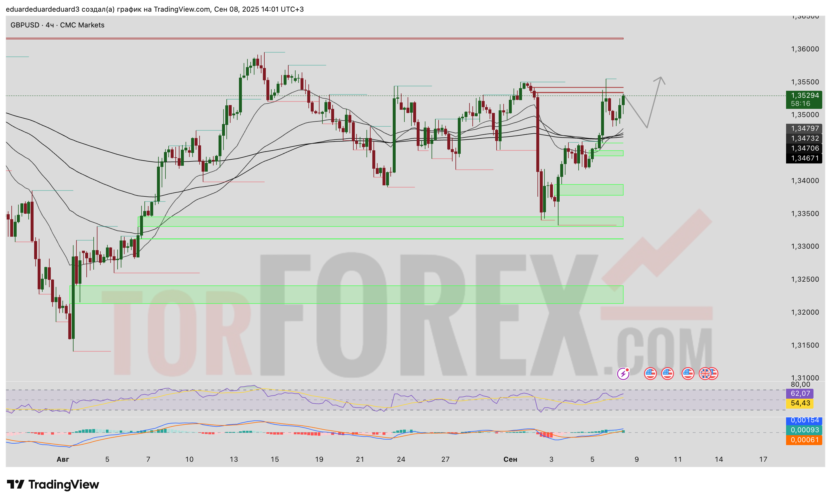 Торговая пара GBP/USD на четырёхчасовом графике показывает уверенное восстановление после глубокого снижения к уровням 1,34 и формирования разворотной структуры. Текущая цена держится у отметки 1,3530, находясь вблизи локального сопротивления. Технический анализ с применением EMA Ribbon, зон FVG, RSI и MACD позволяет выделить возможные сценарии движения на предстоящий торговый день.