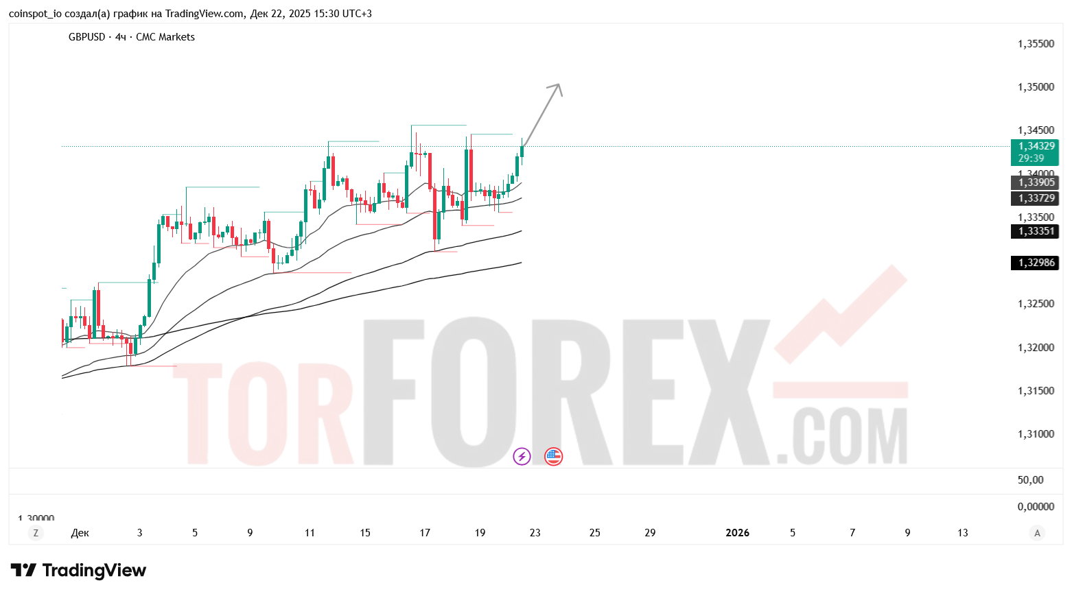 На 23 декабря 2025 года GBP/USD демонстрирует устойчивый восходящий импульс. Основной сценарий — рост к 1.3470–1.3500 USD при пробое сопротивления. Альтернативный сценарий — снижение к 1.3290–1.3260 USD при отказе от уровня 1.3435 USD.