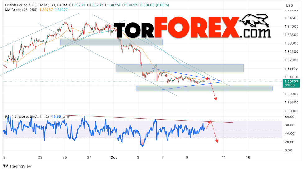 Таким образом, GBP/USD прогноз Британского Фунта на 11 октября 2024 предполагает попытку теста области сопротивления вблизи уровня 1.3105. Затем, продолжение падения с целью вблизи уровня 1.2945. Дополнительным сигналом в пользу снижения Британского Фунта выступит тест линии сопротивления на индикаторе относительной силы (RSI). Отменой варианта падения станет сильный рост Британского Фунта против Доллара США и пробой области 1.3145. Это укажет на продолжение подъёма на Форекс пары с потенциальной целью выше уровня 1.3265.