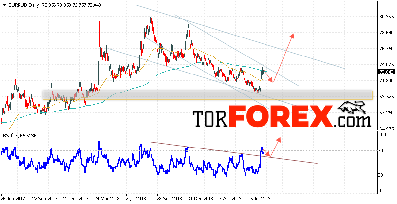 В пользу роста валютной пары EUR/RUB выступит тест области поддержки. Вторым сигналом станет отскок от пробитой линии сопротивления на индикаторе относительной силы. Отменой варианта роста пары EUR/RUB на текущей торговой неделе 12 — 16 августа 2019 станет падение и пробой уровня 68.95 Евро за Рубль. Это укажет на нижней границы нисходящего канала и ускорение падения пары Евро Рубль в область ниже уровня 66.55. Подтверждением роста пары на текущей торговой неделе выступит пробой области сопротивления и закрытие над уровнем 74.75.