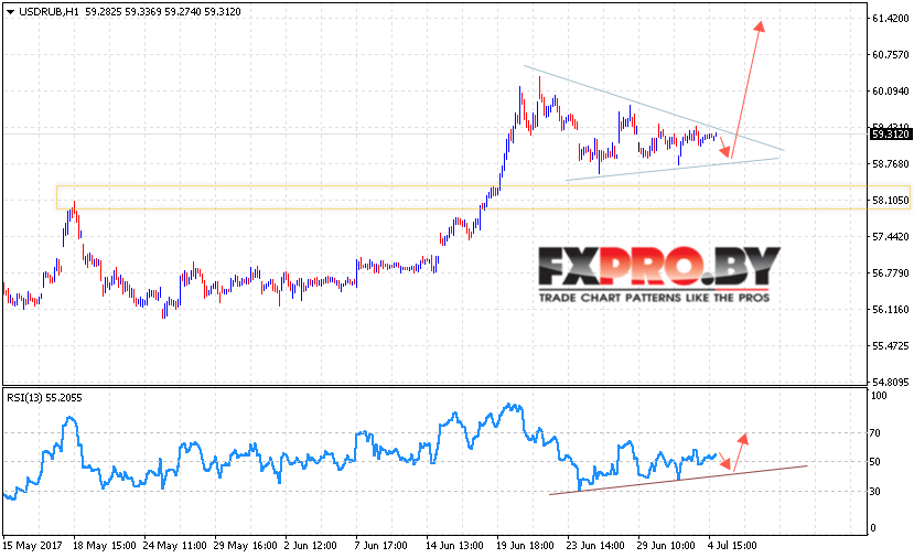 Таким образом, Курс Доллара USD RUB прогноз на завтра на 5 июля 2017 предполагает попытку продолжения роста в рамках начала отработки Форекс модели Треугольник с потенциальной целью роста выше уровня 61 рубль за доллар США, отменой станет падение и пробой области 58.50.