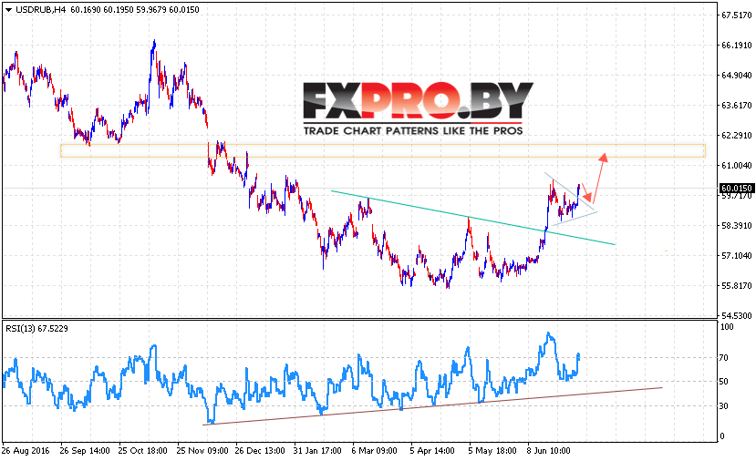 Валютная пара Доллар Рубль USD/RUB продолжает движение в рамках ожиданий и на данный момент есть потенциал для продолжения роста пары в область выше уровня 61. В пользу роста курса Доллара против Рубля выступает пробой верхней границы модели Треугольник.