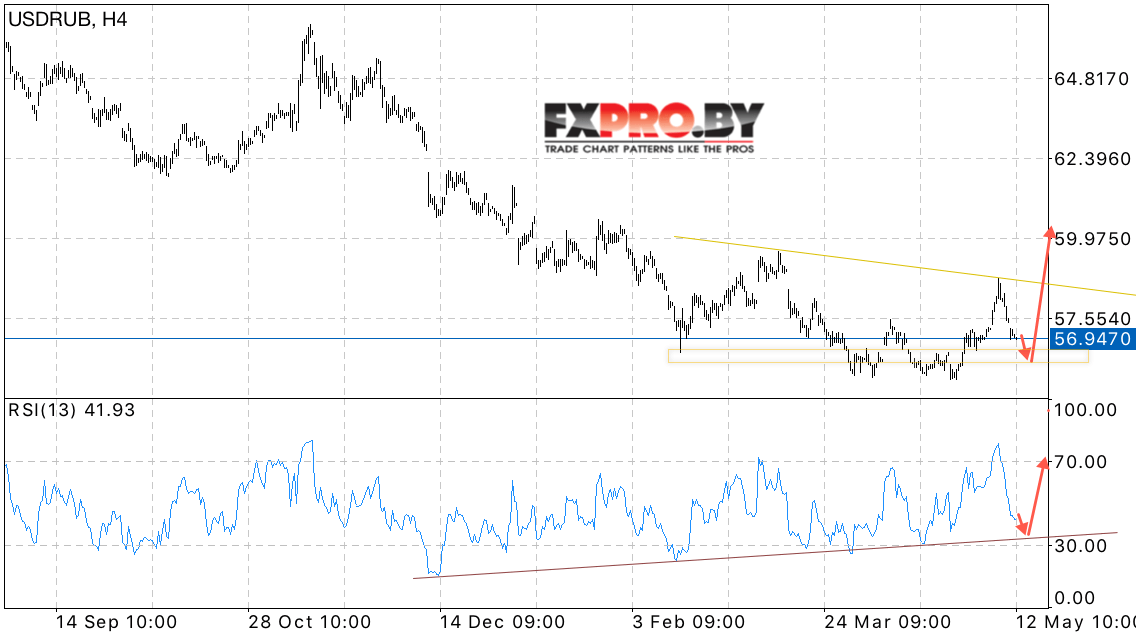 Таким образом, USD/RUB прогноз курса Доллара к Рублю на 15 мая 2017 предполагает попытку падения в область ниже уровня 56.70 рублей за доллар США, откуда стоит ожидать рост курса доллара против рубля в рамках начала отработки разворотной Форекс модели Голова и плечи.