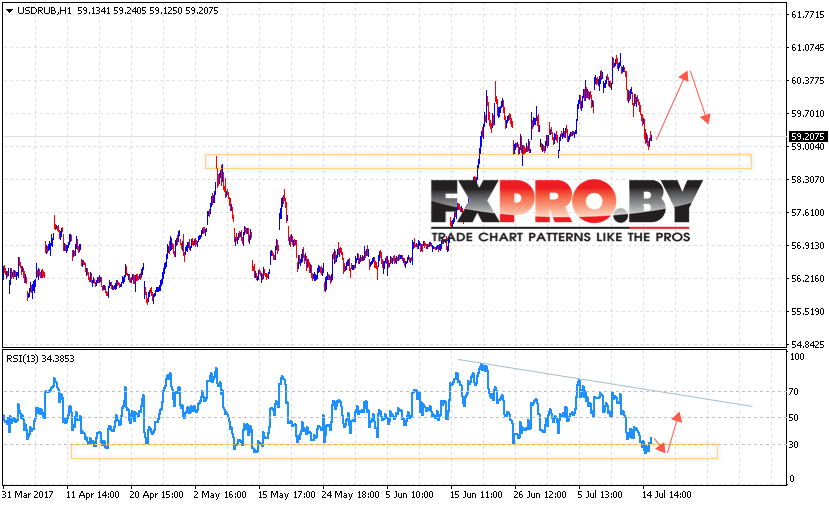 Таким образом, USD/RUB прогноз курса Доллара к Рублю на 18 июля 2017 предполагает попытку роста пары выше уровня 60.40, откуда стоит ожидать отскок и падение пары USD/RUB  в рамках начала отработки Форекс модели Голова и плечи, отменой падения станет пробой уровня 61.10.