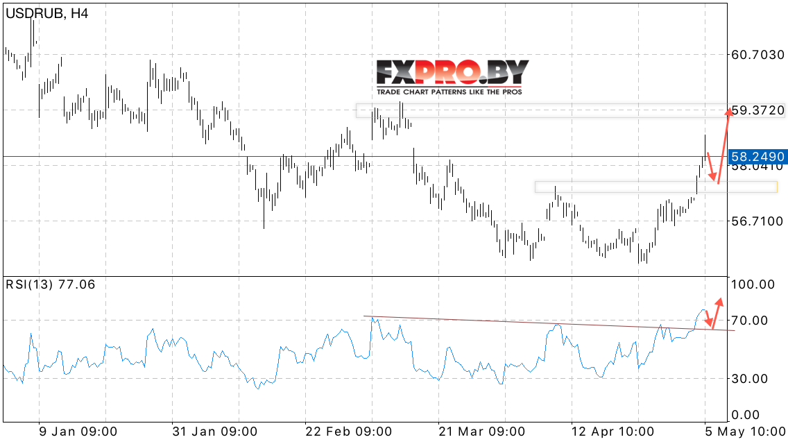 Таким образом, USD/RUB прогноз курса Доллара к Рублю на 8 мая 2017 предполагает попытку коррекции в область 57.80 и продолжения роста в область выше уровня 59.50 рублей за доллар США, дополнительным сигналом выступит тест пробитой линии тренда на индикаторе относительной силы, отменой варианта роста станет падение и пробой области 56.80 рублей.