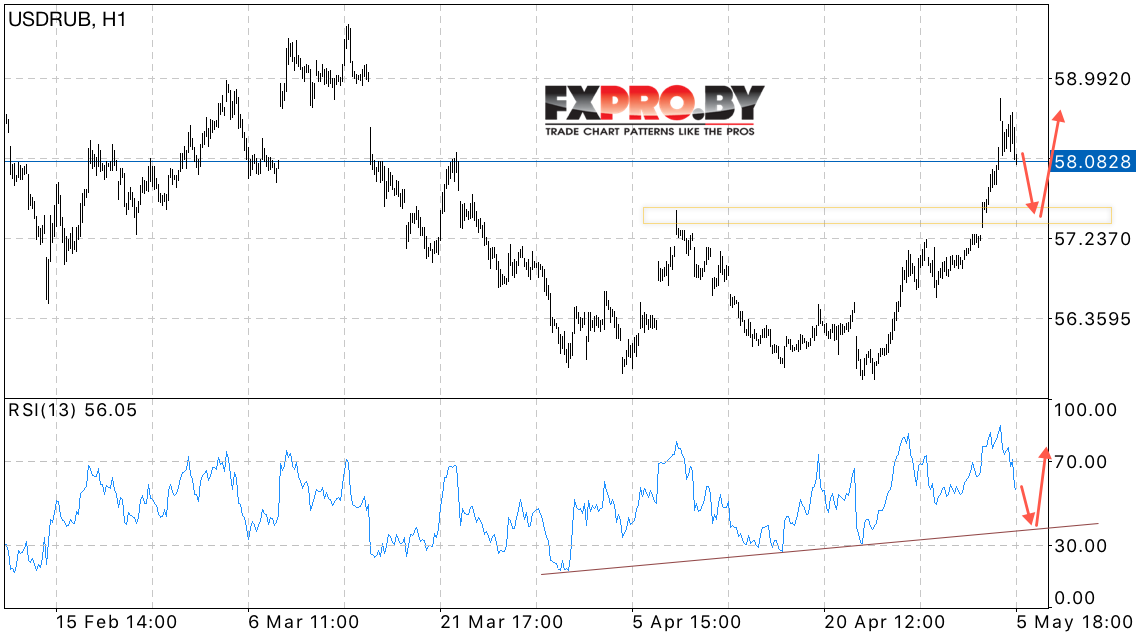 Таким образом, USD/RUB прогноз курса Доллара к Рублю на 9 мая 2017 предполагает попытку коррекции в область поддержки и продолжения роста пары в область выше уровня 59.50 в рамках отскока от линии тренда на индикаторе относительной силы, отменой станет пробой уровня 57.