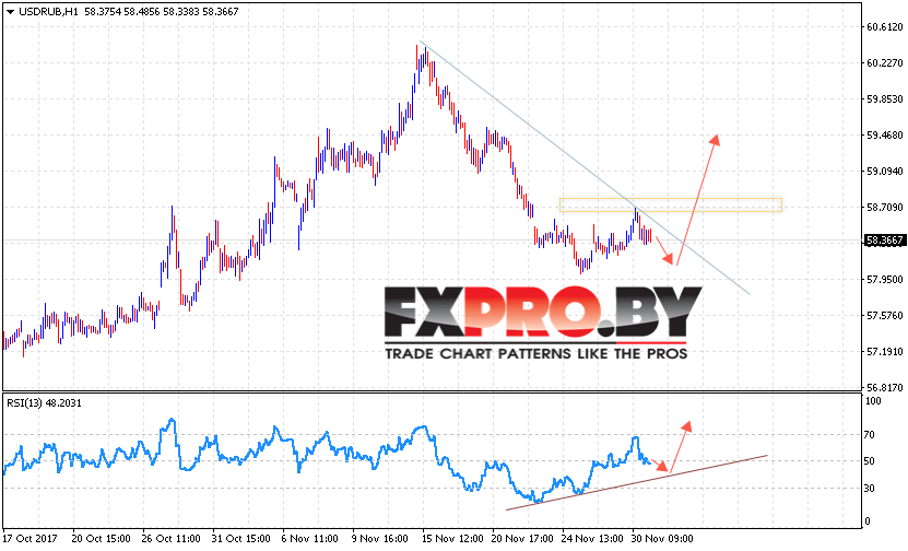Таким образом, USD/RUB прогноз курса Доллара на 1 декабря 2017 предполагает попытку теста уровня 58.00, откуда стоит ожидать отскок и продолжение роста курса Доллар против Рубля с целью выше уровня 59.20, отменой роста станет пробой области 57.70.