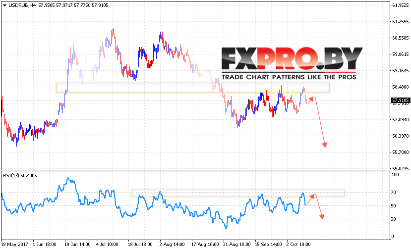 Таким образом, USD/RUB прогноз курса Доллара на 11 октября 2017 предполагает попытку теста уровня 58.10 рублей за доллар и продолжения падения курса Доллара в область ниже 56 рублей за доллар США, дополнительным сигналом в пользу снижения USD/RUB выступает тест области сопротивления на индикаторе относительной силы, а также формирование разворотной модели Голова и плечи.