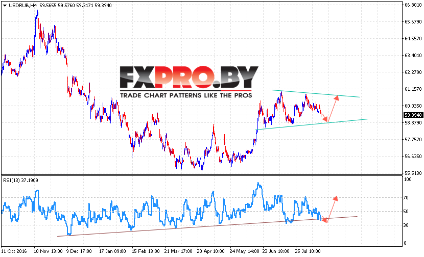 В пользу роста пары Доллар Рубль выступает тест линии поддержки на индикаторе относительной силы. Ожидать ускорения роста пары USD/RUB стоит с пробоем верхней границы модели Треугольник и закрытием котировок выше уровня 61. Отменой варианта роста пары Доллар Рубль на Форекс станет падение и пробой области 58.50, что укажет на продолжение снижения пары и отработки модели Треугольник с целью ниже уровня 55.