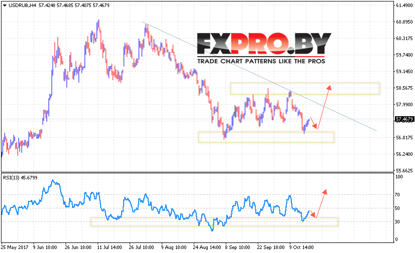 Таким образом, USD/RUB прогноз курса Доллара на 18 октября 2017 предполагает попытку теста нижней границы восходящего канала и продолжения роста курса Доллара против Рубля в область выше уровня 58.60 рублей за доллар США, дополнительным сигналом в пользу роста USD/RUB выступает тест линии на индикаторе относительной силы.