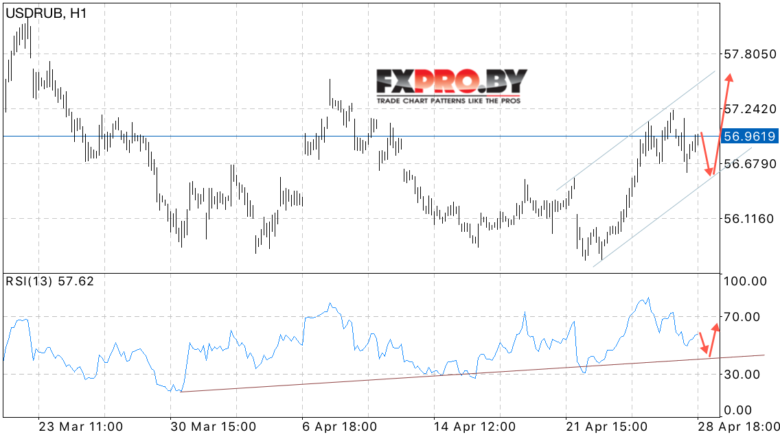 Вблизи области 56.65 рублей за доллар будет потенциал для формирования бычьей Форекс модели 5-0, откуда стоит ожидать продолжения роста пары в область выше уровня 57.50 рублей за доллар США. В пользу варианта роста выступит плотный тест восходящей линии тренда на индикаторе относительной силы. Отменой варианта роста пары станет падение и пробой области 56 рублей за доллар США, что укажет на продолжение снижения.
